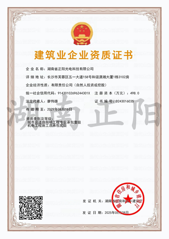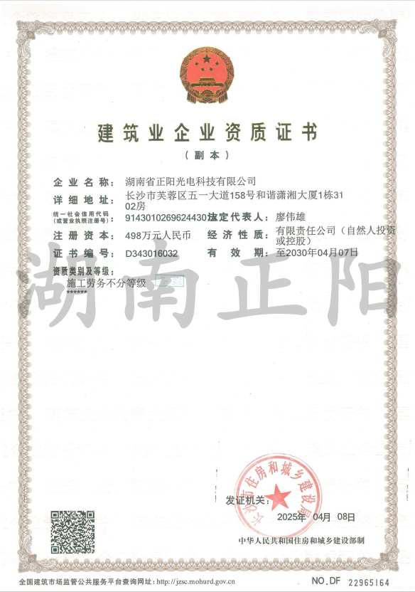 2025年4月8日,經(jīng)長(zhǎng)沙市住房和城鄉(xiāng)建設(shè)局審核批準(zhǔn),湖南省正陽光電科技有限公司成功獲得“施工勞務(wù)”資...